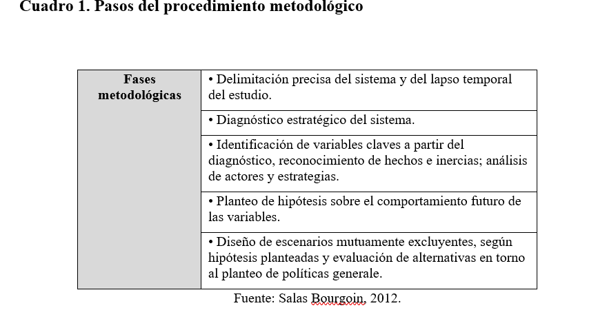 Sobre el procedimiento metodológico, es necesario mencionar la necesidad de abstraerse de las subjetividades y la participación de actores diversos para establecer interrogantes que traccionen los potenciales escenarios con el menor sesgo posible por parte de los autores. Debe reconocer, al mismo tiempo, las limitaciones que impone abordar entrevistas a determinados actores y hacer dialogar los resultados de manera que sean insumos para todas las etapas. Por otro lado, también es pertinente reconocer que el abordaje es dinámico y flexible, lo cual aporta mucha variabilidad según el momento en que se lleva a cabo, pudiendo variar sustancialmente según el momento y los actores por indagar.