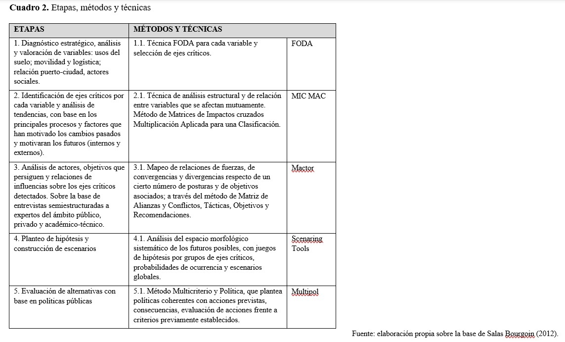 La metodología adoptada integra la propuesta de Salas Bourgoin (2012) a la propuesta por Godet (2000). Se asume la construcción de escenarios prospectivos para el puerto de Buenos Aires y las transformaciones del territorio urbano-portuario, considerando las siguientes etapas asociadas con un método y una técnica de procesamiento y sistematización, apoyada en software libre del sistema Lypsor.