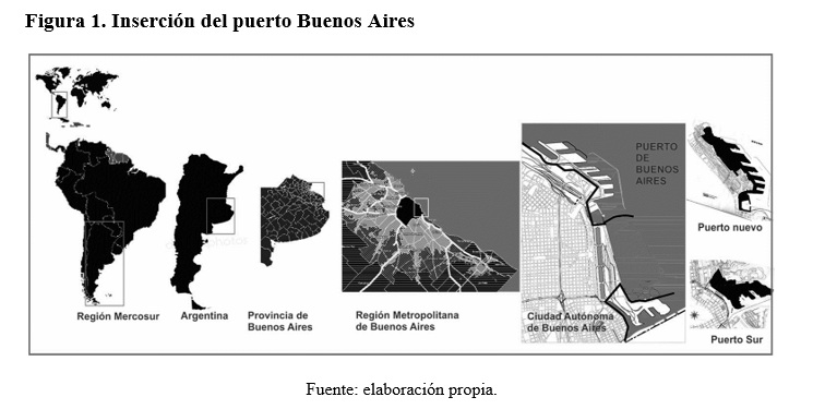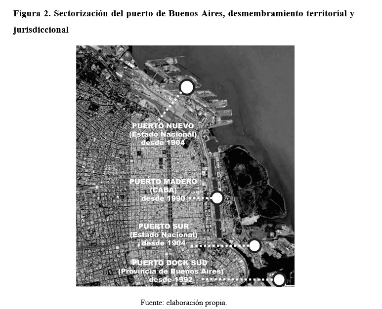 El actual puerto operativo de Buenos Aires (1923) corresponde al sector que ocupan el Puerto Nuevo y el Puerto Sur, ubicados al norte y sur respectivamente del barrio Puerto Madero (antiguo puerto, construido en 1890, reconvertido a ciudad en 1990) (Figura 1). Esta sectorización se corresponde con la promulgación de la Ley 24.093, de descentralización, emergente de las políticas de la década de 1990. La misma permitió transferir el dominio y la administración de los puertos estatales a las provincias.