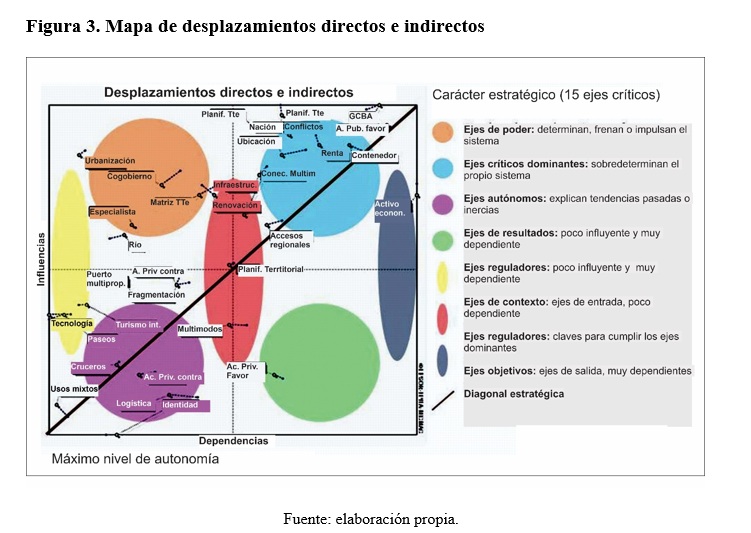 Se observa el mapa de desplazamiento que sintetiza la interpretación de los datos; siendo los ejes críticos dominantes: administración del GCBA, promoción del contenedor, planificación del transporte, conectividad multimodal, ubicación estratégica, administración del Estado Nacional, puerto como activo económico, conflictos en la interfase, actores públicos a favor y accesibilidad regional. Mientras los ejes de poder que pueden frenar o impulsar las acciones para concretar los ejes dominantes son: urbanización de barrios informales, administración cogobernada, definir matriz de transporte, la visión de los especialistas y la posibilidad de acceder al río; en tanto que los ejes reguladores que guían la concreción de los ejes dominantes son: la planificación territorial, la renovación urbana y dotar de infraestructuras de transporte.