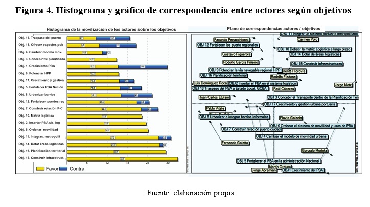 El cuadro de correspondencia entre actores y objetivos demuestra que los actores que se acercan a las variables de movilidad y logística son los representantes del Estado, especialistas y privados que acuerdan con los objetivos de promoción de infraestructuras y planificación del transporte (cuadrante superior derecho); los actores privados y especialistas que promueven la integración regional se acercan a dichos objetivos (cuadrante superior izquierdo); por otro los actores de la AGP.S.E. acuerdan con los objetivos que fortalecen el puerto de Buenos Aires.