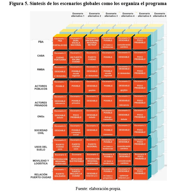 Sobre la base de lo mencionado precedentemente, el resultado de este escrito sintetiza sistémicamente el procedimiento metodológico y los cinco escenarios alternativos obtenidos para los cuales se plantearon algunos lineamientos exploratorios que podrían conducir a políticas públicas de ordenamiento territorial urbano-portuario.