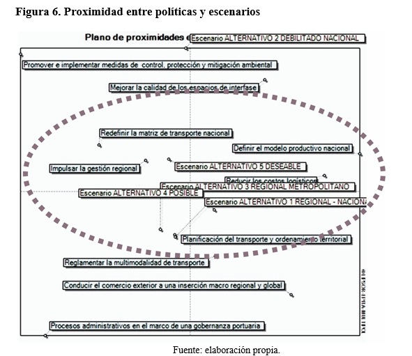 La evaluación de políticas según los escenarios muestra que los escenarios E1, E3, E4 y E5 están próximos entre sí y requieren políticas similares relacionadas con la planificación, los costos y los actores sociales, y no dependen tanto –ya que mantienen cierta distancia– de acciones más autónomas, como la protección ambiental o la implementación de un marco de gobernanza; asimismo, se observa que la promoción de un modelo productivo de mediano y largo plazo a escala nacional está distante de todos los escenarios, en principio esto indica que hay políticas más generales y otras de aplicación más directa sobre las transformaciones territoriales urbano-portuarias (Figura 6).