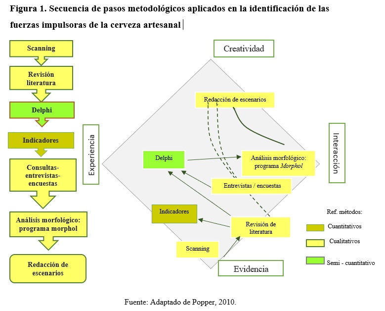 Para la elaboración del análisis prospectivo de la industria de cerveza artesanal se empleó una combinación de 6/7 técnicas, predominando en la secuencia de pasos metodológicos aplicados los métodos cualitativos (Figura 1).