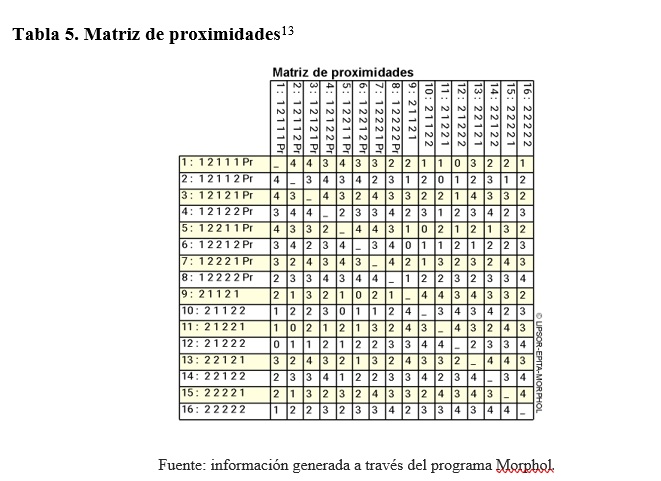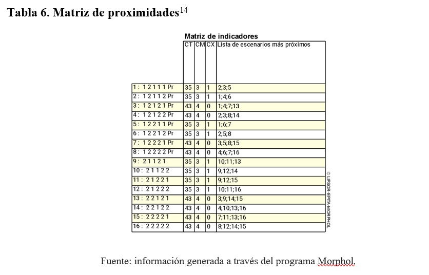 Mediante la aplicación del programa Morphol los escenarios se representan en una Matriz de proximidades (Tabla 5), que brinda información acerca del número de hipótesis comunes entre cada escenario. Esta matriz muestra la relación de proximidad que existe entre cada escenario. En esta matriz el rango de influencias va de 0 a 3, con identificación de influencias potenciales: donde 0= no influye; 1=influencia débil; 2= influencia media; 3= influencia fuerte; 4= influencia potencial.